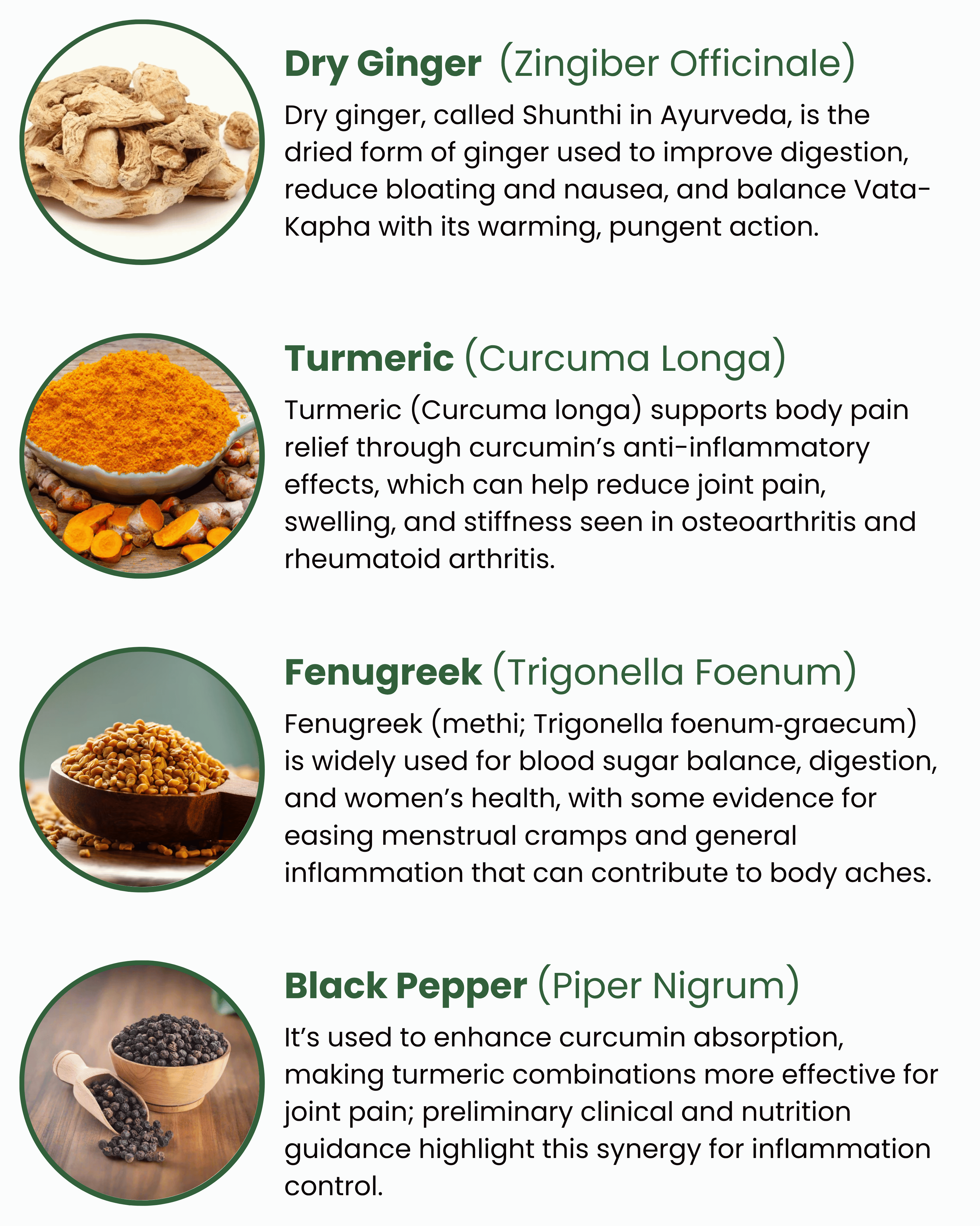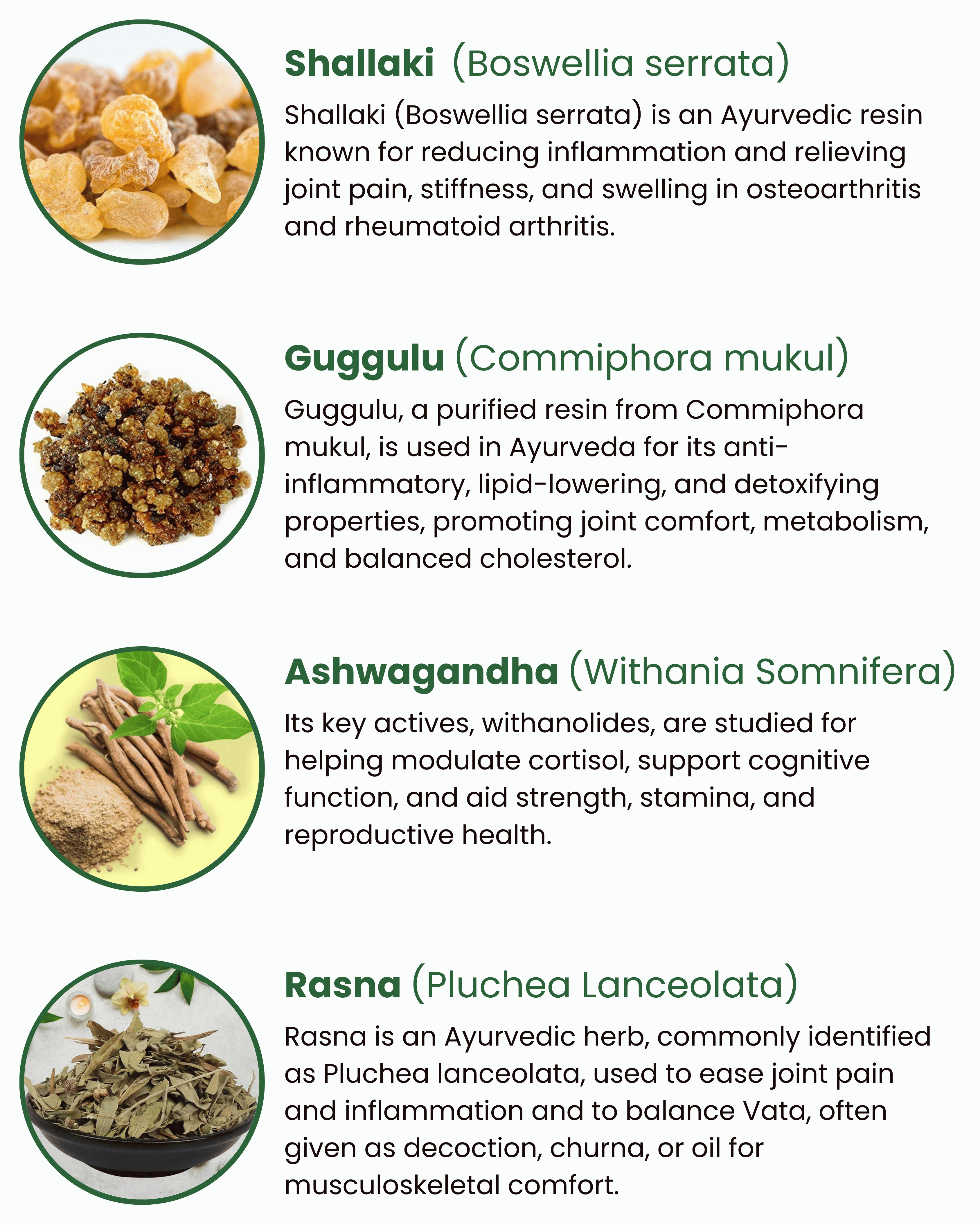 It combines herbs noted for anti‑inflammatory and analgesic actions—such as Sonth (dry ginger), Pippal/Pippali, Kali Mirch (black pepper), Ashwagandha, Nirgundi, and Suranjan—to modulate inflammatory pathways and ease stiffness.